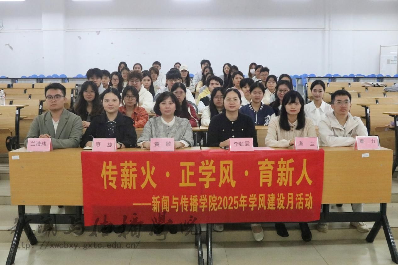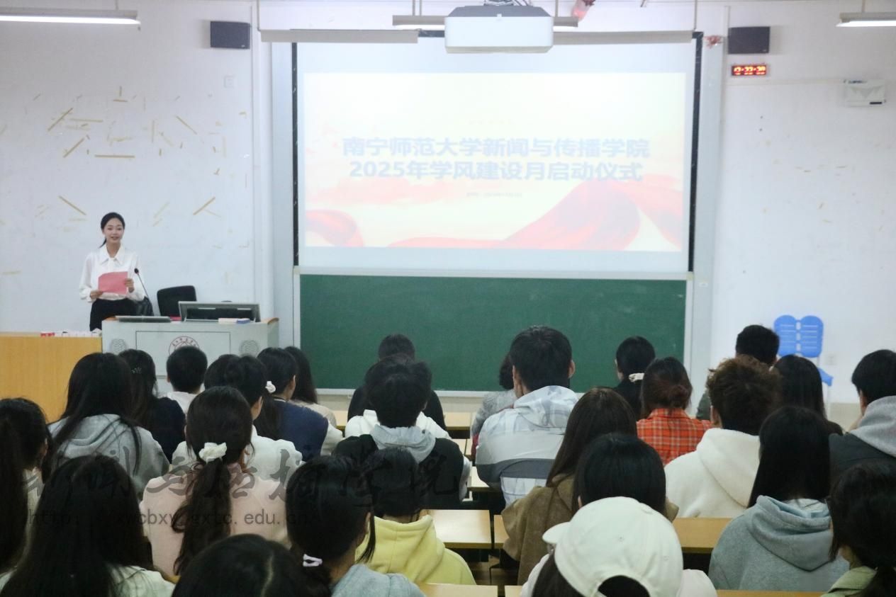 11月3日中午,新闻与传播学院在文综801教室举行2025年学风建设月启动仪式。学院党委副书记黄敏,辅导员李虹霏、惠旋、兰浩玮、唐兰、覃力,团委学生会部门代表以及各班级代表到场参加。仪式由学生会外联部部长邱娴主持。
