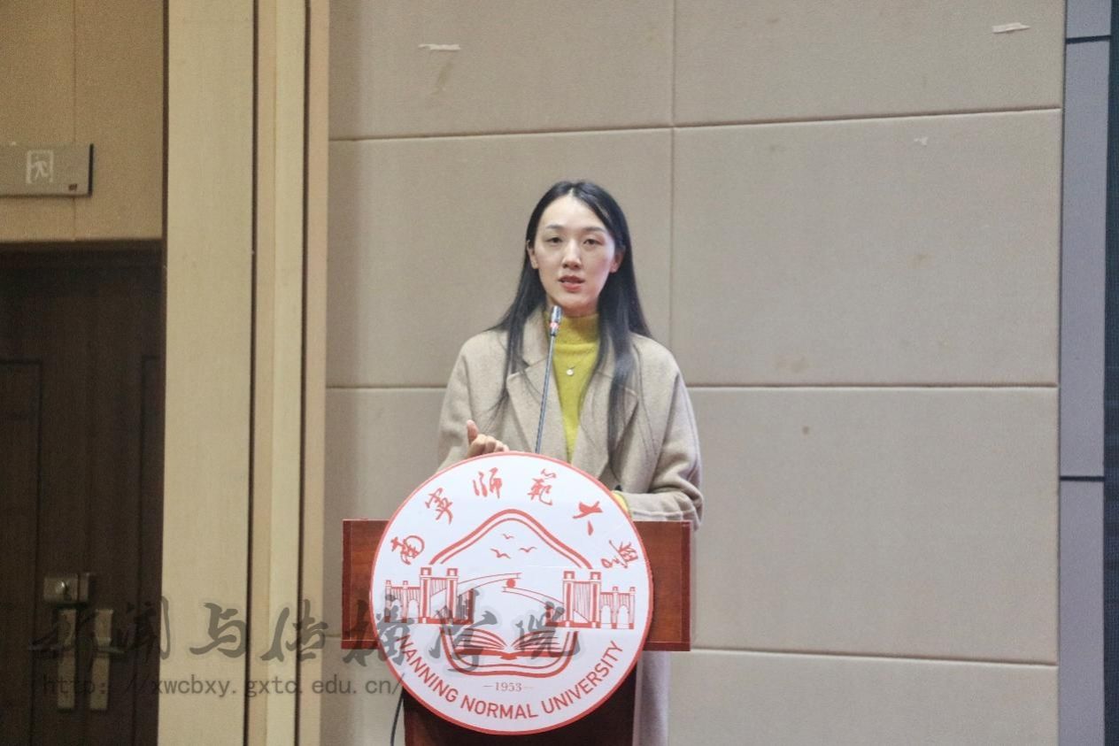 会议伊始,“语” 你同行实践团的宣传组、宣讲组、调研组、后勤组各小组代表依次登台,结合实践经历与图文素材,生动分享了在乡村一线的服务故事与感悟收获。随后,实践团队长高艺涵同学从团队构成、活动开展、成果转化三个维度进行总结汇报。她介绍,实践期间团队成员扎根乡村实际,精准对接当地需求,开展了形式多样的教育帮扶、文化宣传与科技服务活动,让青春力量在基层落地生根。在活动调研期间,团队产出的优秀作品成功获得第八届全国大学生网络文化节自治区教育行政部门推荐资格,相关活动启动推文也被《南宁日报》等媒体转发报道,取得了良好的宣传效果与社会反响。