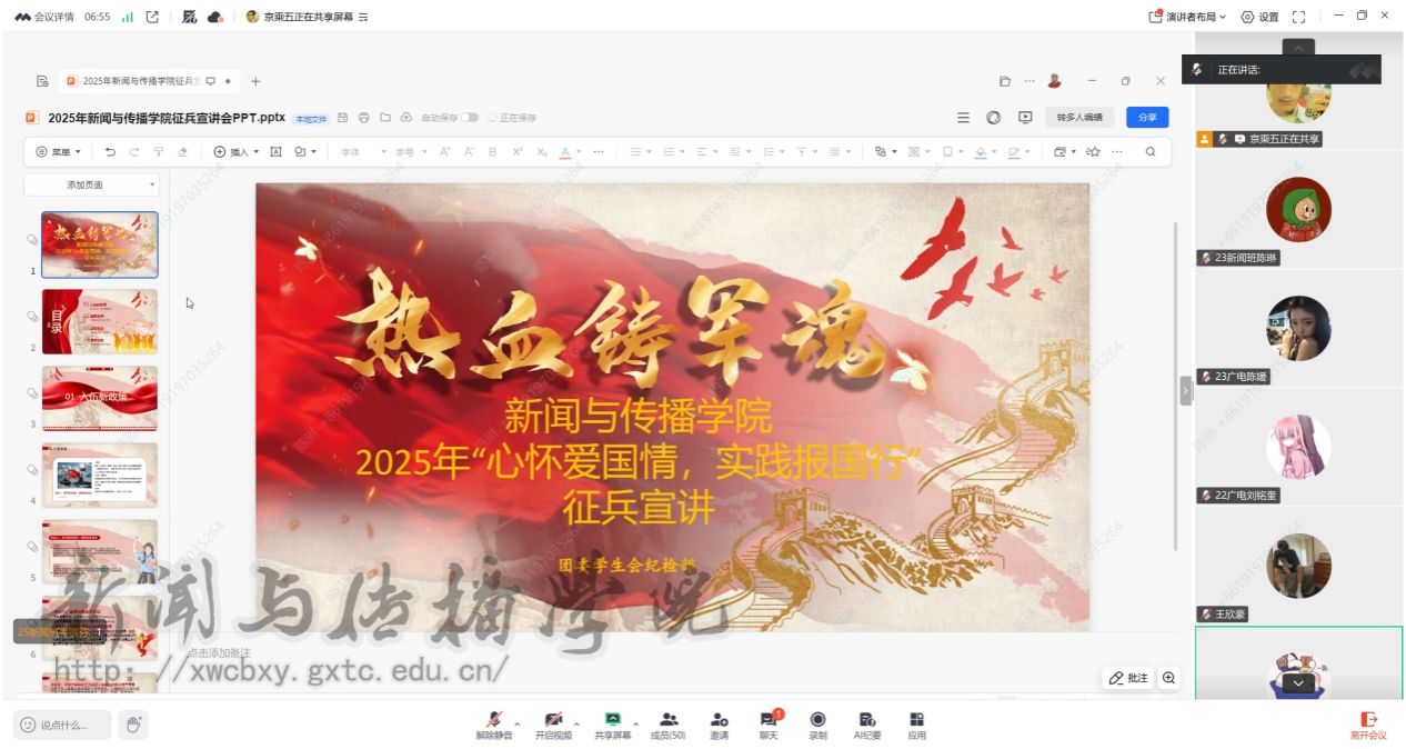 为帮助同学们深入了解征兵政策,进一步激发爱国热情与报国志向,12 月 18 日晚,新闻与传播学院召开2025年下半年线上征兵宣讲会。学院辅导员覃力老师、2022级退役大学生莫昭炬同学以及 22-25 级全体男同学、部分女同学参加会议。