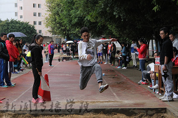 随着主裁判手中红色小旗的挥舞落下,男子三级跳的比赛正式开始。在我院选手登场之前,各个学院的选手都发挥出了较高水平。在第一轮比赛接近尾声时,我院选手27号程博登场。只见他半蹲身姿,瞬间便如箭般射向沙坑,在白线前奋力一跃,跳出了3.28米的成绩。我院28号选手李国杰在程博后登场。这时候又下起了绵绵小雨,场地更加湿滑,但他仍然冷静起跑加速,跳出了3.18米的成绩。第一轮比赛中最后登场的是我院的29号廖倡华。此时我院与其他学院成绩差距较大。廖倡华选手顶住压力,奋力一跃,跳出了第一轮我院最高成绩——3.8米,缩小了我院与其他学院的成绩差距。